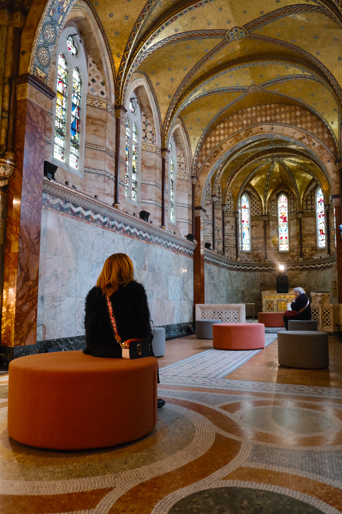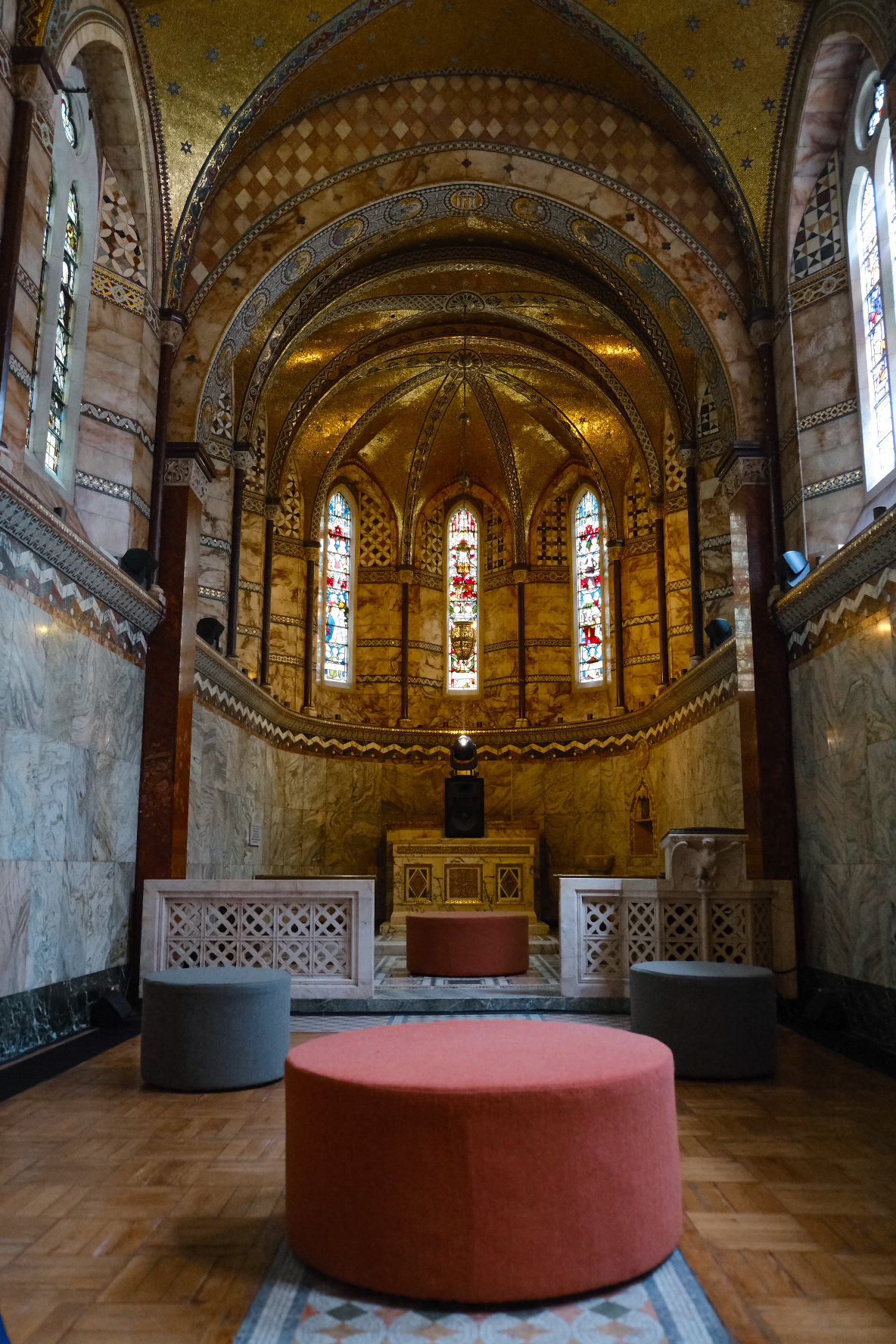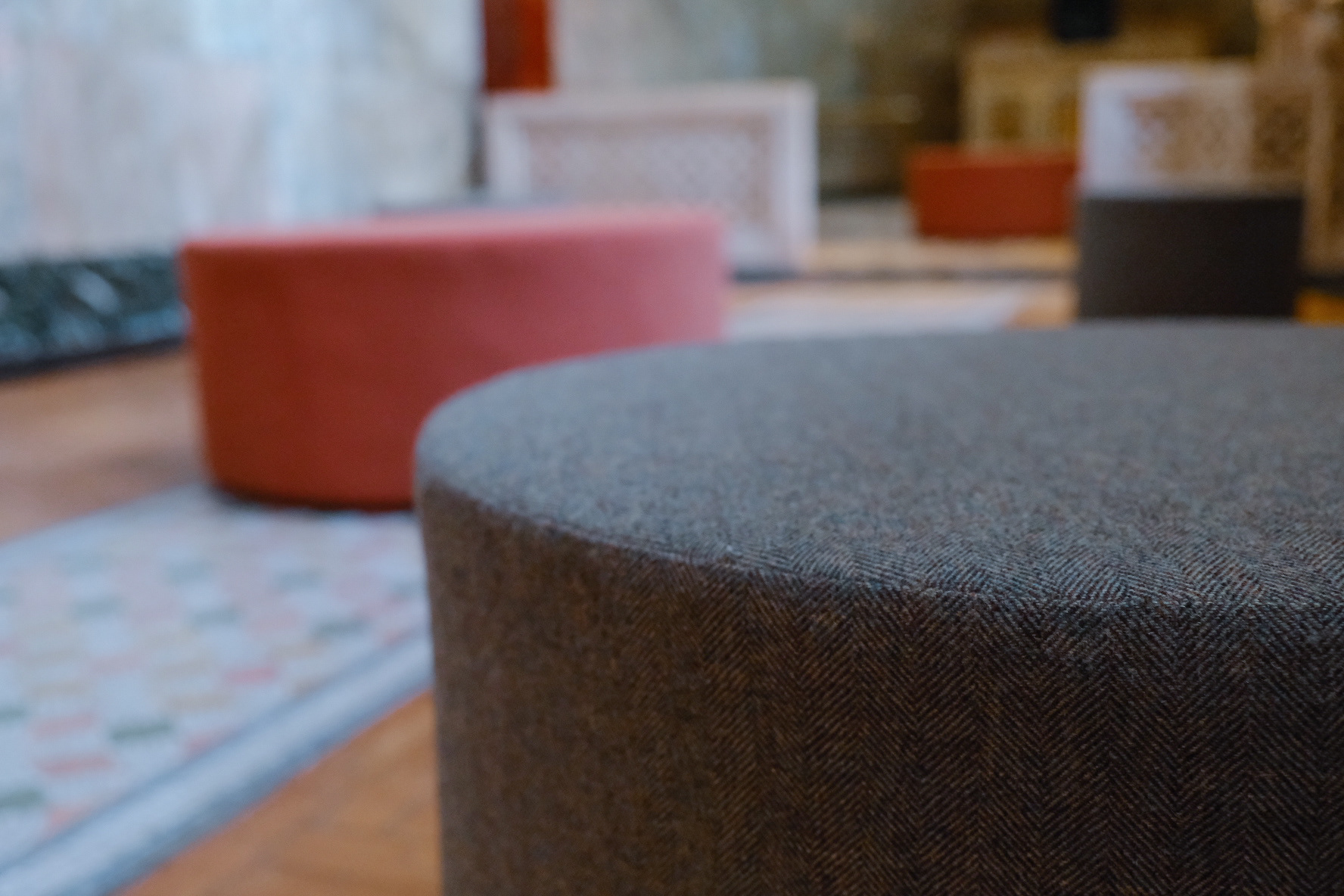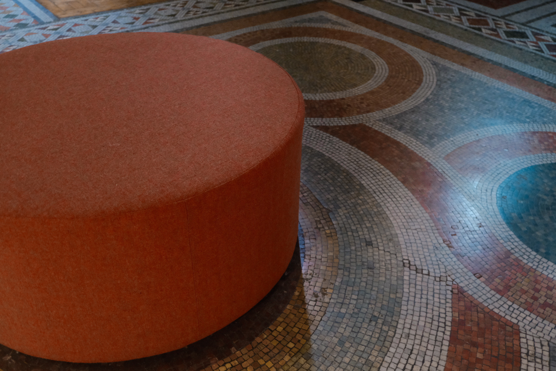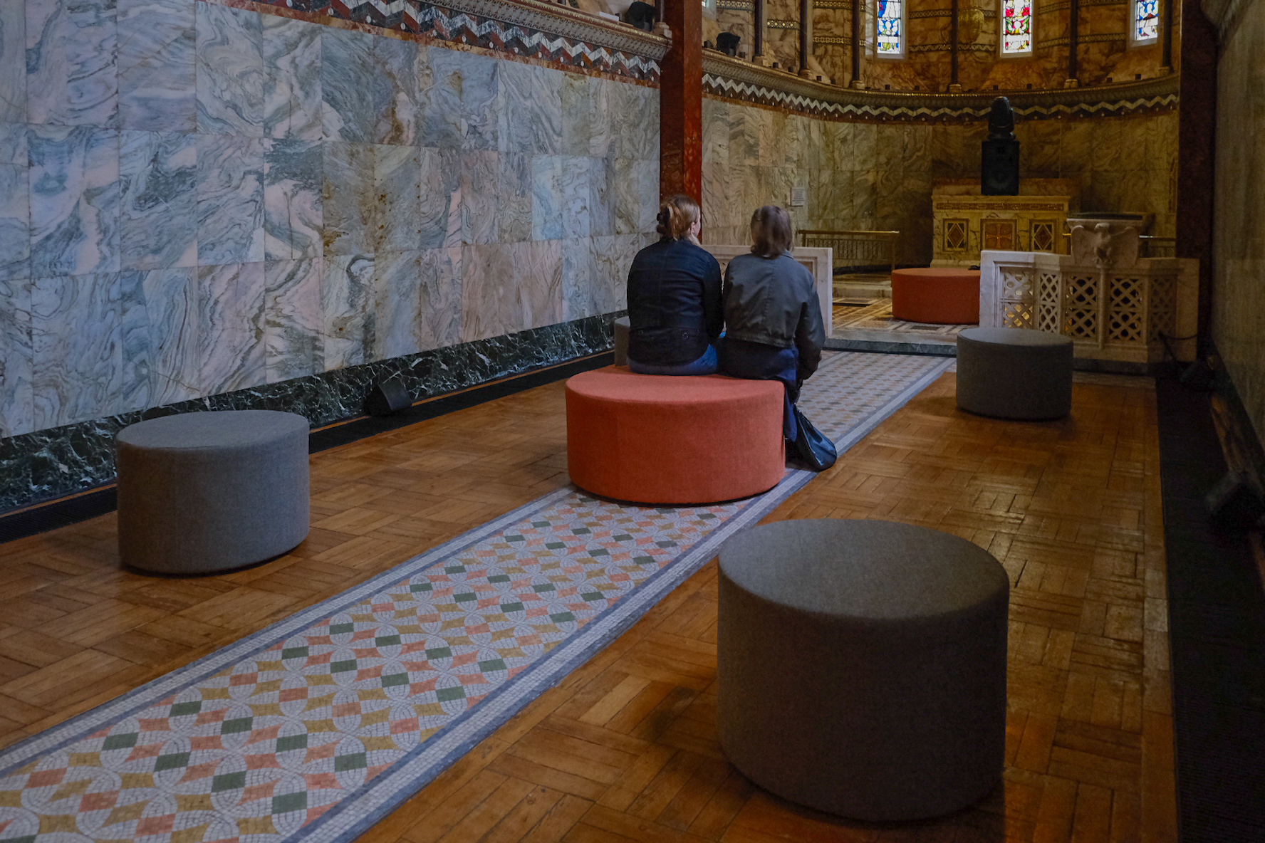 Bespoke stools were designed, produced, and installed at Fitzrovia Chapel, London. The design draws directly from the chapel’s mosaic floor patterns, with fabrics carefully selected to reflect the colours of the tiles—an approach made possible through bespoke production.