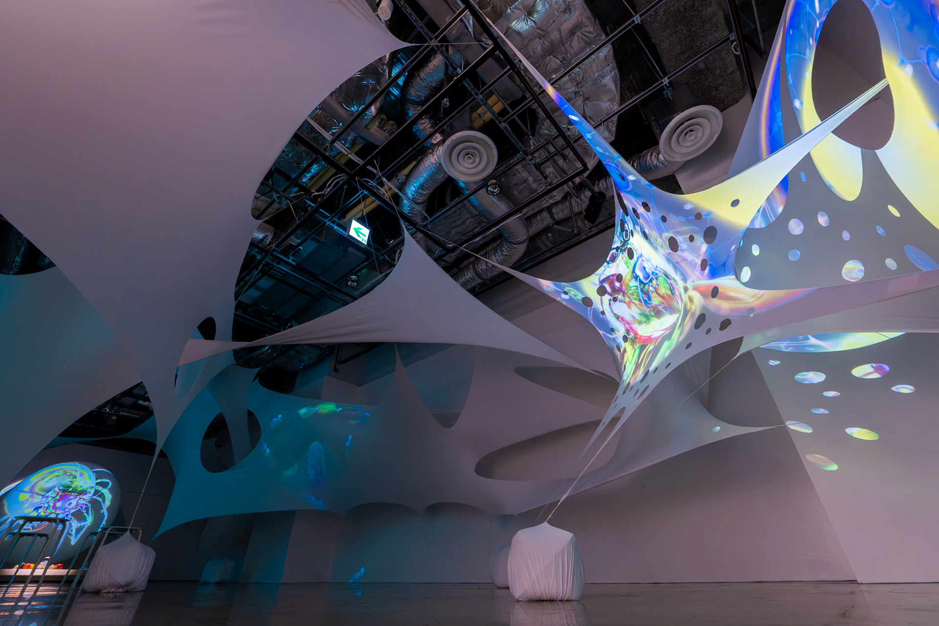 Stretch fabrics were used to create a complex, interwoven structure expressing the world of ants - the central theme of the exhibition.