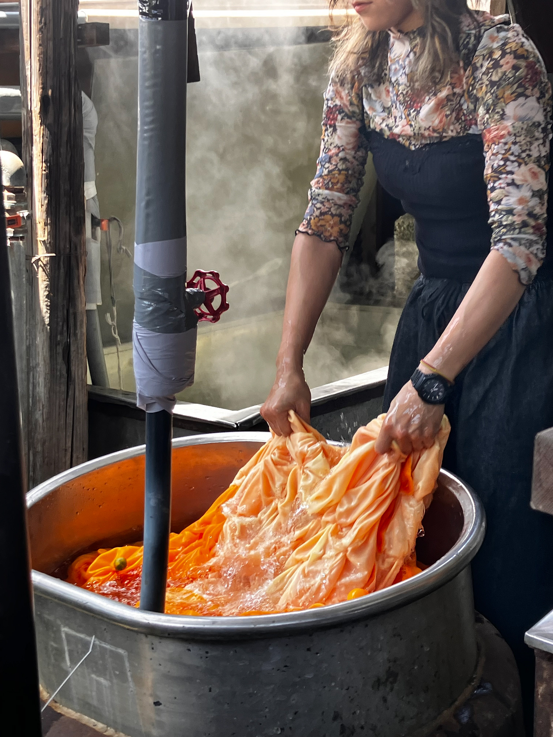 Heating polyester fabric with boiling water, then washing it to apply "SHIBORI" patterns (a traditional Japanese technique)
